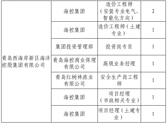 为满足集团业务发展需要,青岛西海岸新区海洋控股集团有限公司现面向社会公开招聘工作人员17名,具体招聘公告如下: